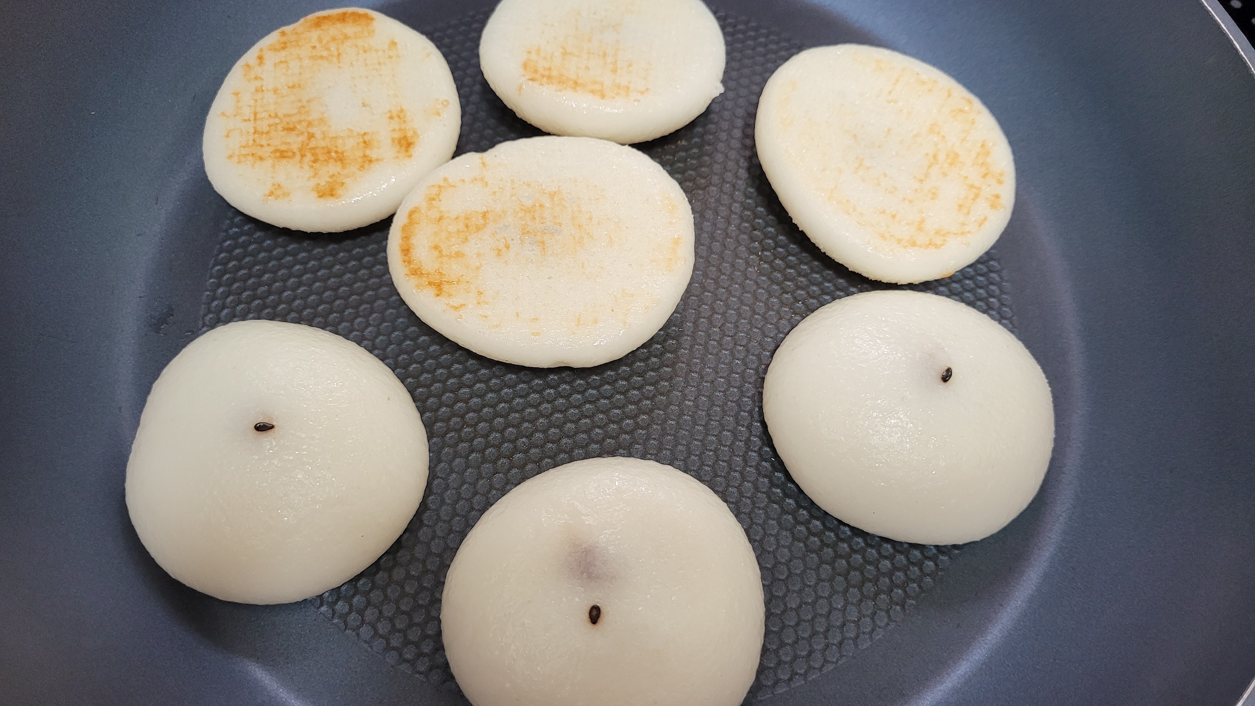 떡에 약간의 기름이 발린듯 반들반들해서 후라이팬 낮은 온도에 기름을 두르지 않고 떡을 넣어 주었습니다.